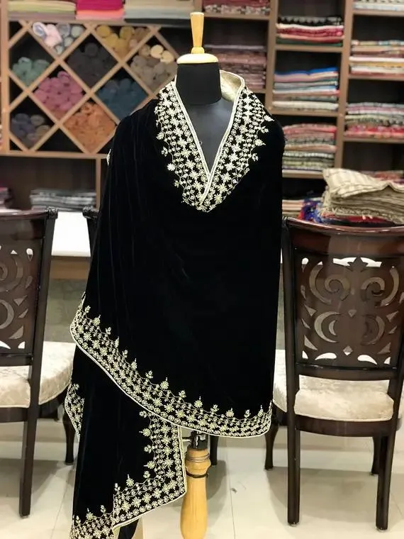 Rich, plush velvet fabric; Heavy embroidery border; Traditional formal accessory; Perfect for winter weddings.